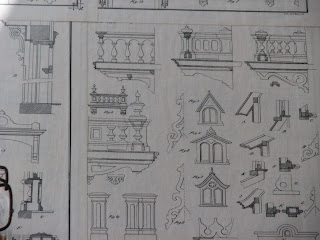 This is an old drafting table that needed a new top. I cut a piece of 1" plywood and covered the top in old Victorian architectural drawings.
